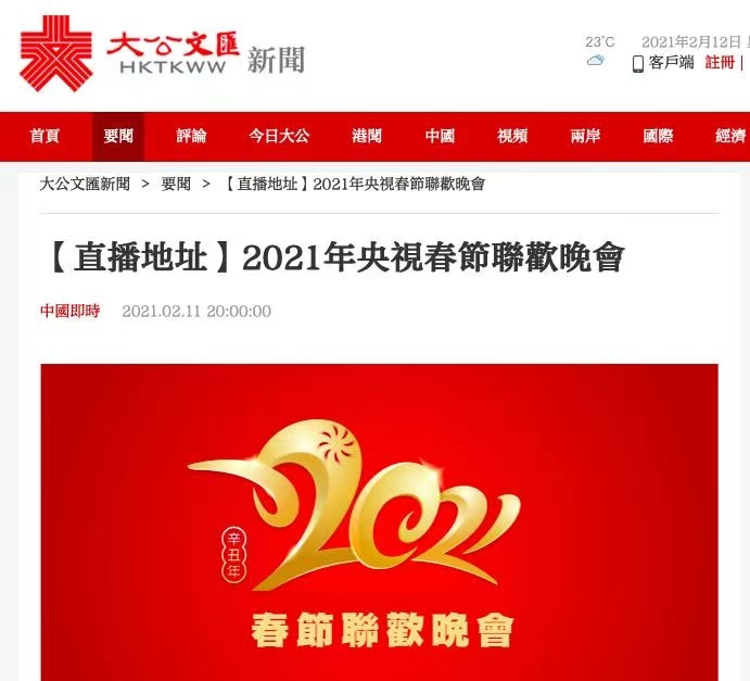 香港电视广播有限公司(TVB)全程直播了春晚,大公文汇、《香港商报》、橙新闻也在新媒体平台上进行网络在线直播或摘播,吸引大量观众实时收看,并引起强烈反响。澳门广播电视公司及旗下新媒体平台澳广视网站对春晚进行了转播。