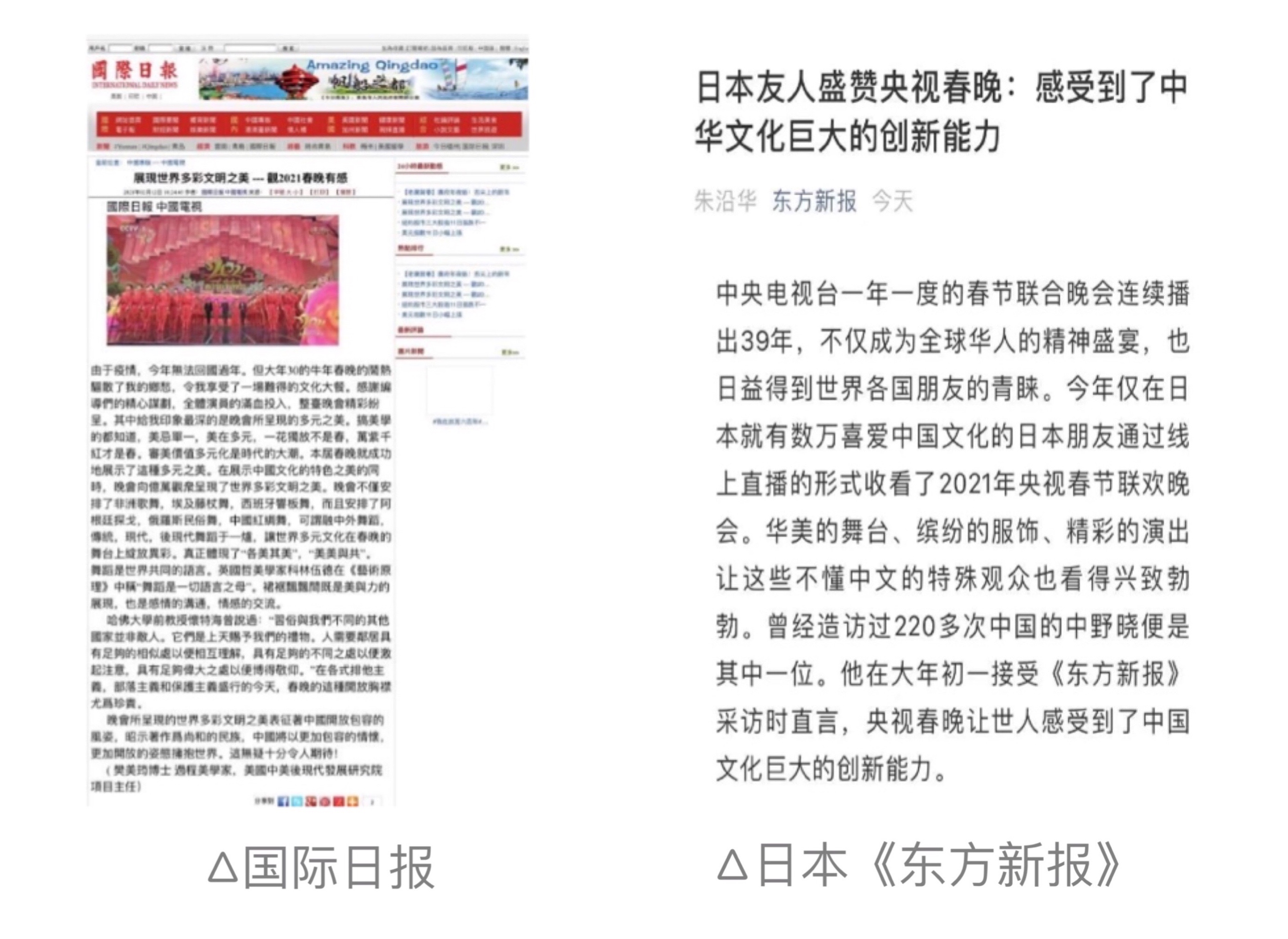 境外多家华文媒体高度评价春晚盛况,美国《国际日报》发表了题为《展示世界多彩文明之美——观2021春晚有感》的文章表示,本届春晚在展示中国文化的特色之美的同时,向亿万观众呈现了世界多彩文明之美。日本《东方新报》刊文表示,通过春晚日本友人感受到了中国文化巨大的创新能力及未来的无限可能。报道指出,当代中国对于优秀传统文化精粹的挖掘、继承、发展和传播所取得的成就令人瞩目。