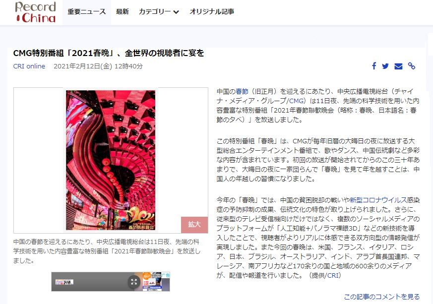 日本最大的中国资讯网站Record China发布报道称,今年的春晚聚焦中国脱贫攻坚的成就、新冠疫情防控的战略性成果等,紧扣时代主题,同时充分展示了中国的传统文化。此外,新技术的应用也为观众们打造了一场令人震撼的视听盛宴。