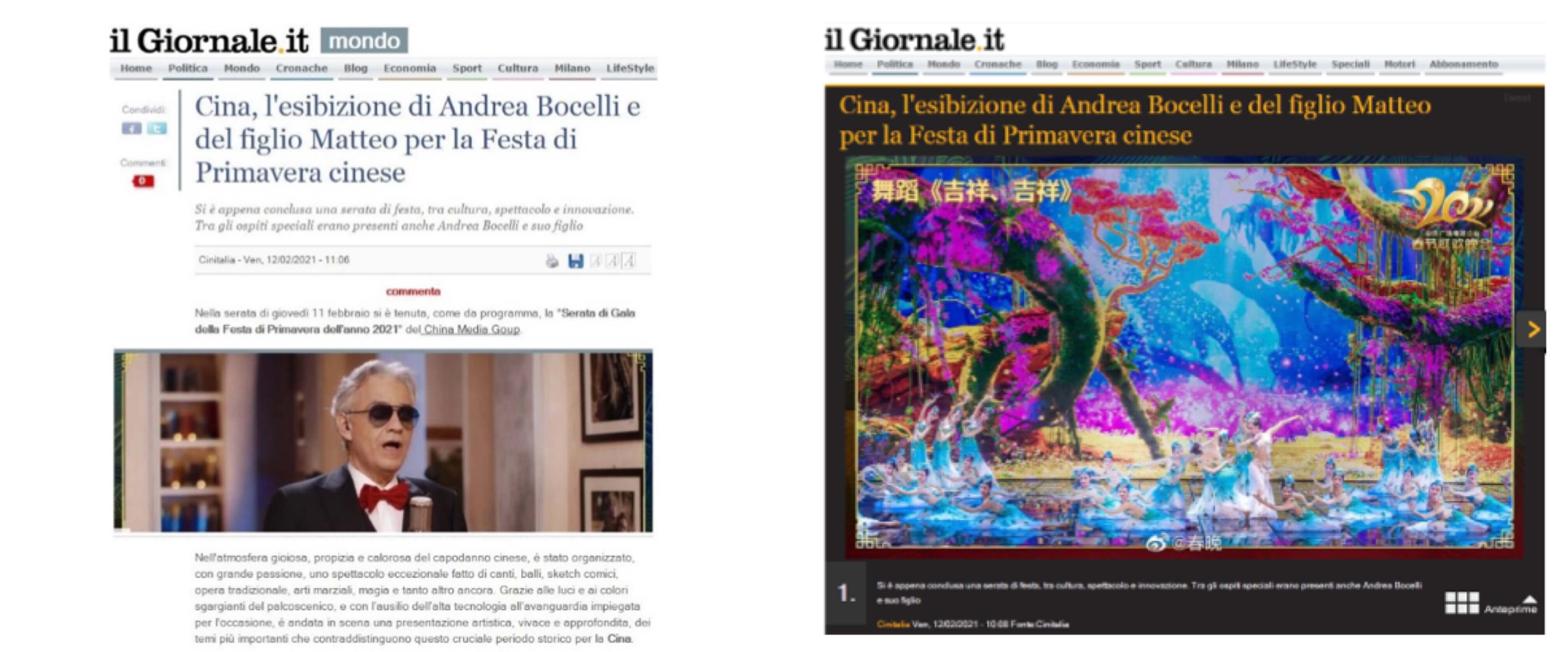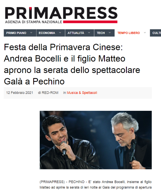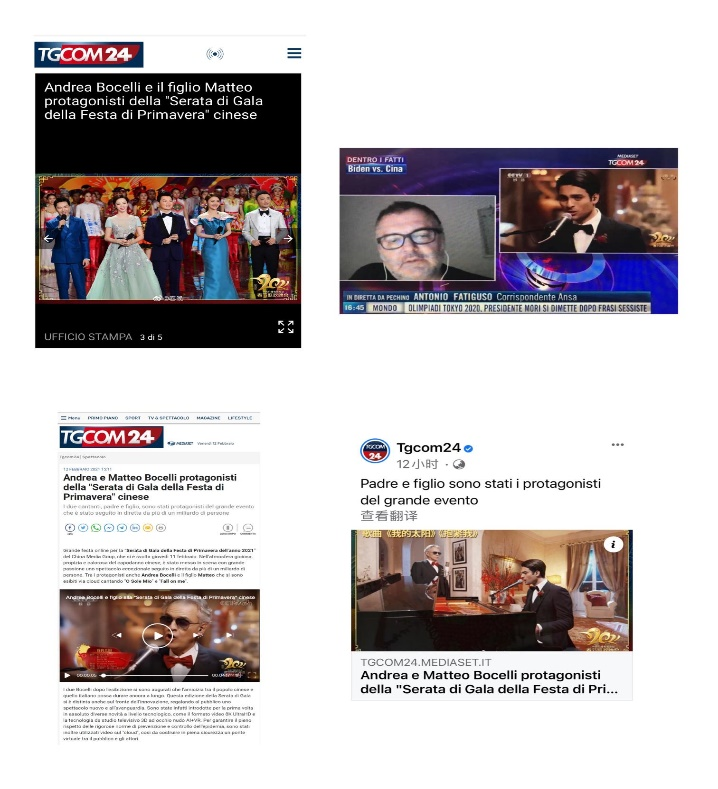 意大利重要的全国性报纸之一《日报》在网站发表题为《波切利父子春晚献唱贺新春》的文章。文章写道,中央广播电视总台春节联欢晚会以歌舞、小品等形式,将建党百年、疫情防控等主题生动呈现。意大利歌唱家波切利父子在晚会中演唱《我的太阳》等歌曲。意大利网友在社交媒体纷纷留言,表示愿中意两国人民友谊长存。意大利最大的电视台及新闻网站Tgcom24、意大利Teleambiente电视台在晚间资讯栏目、意大利全国性通讯社Primapress分别发表了相关报道。