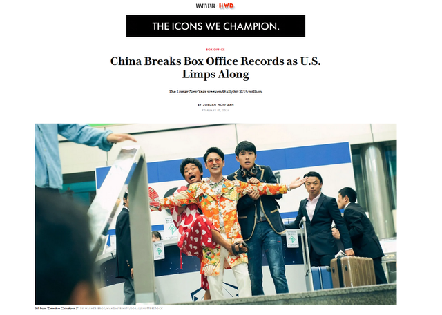 美媒《综艺》关注到,由陈思诚执导的动作喜剧《唐人街探案3》首周末获得4.24亿美元(约合27.4亿元人民币)的“巨额票房”。《名利场》称,这4.24亿美元打破《复仇者联盟4:终局之战》2019年创下的美国首映周末票房纪录(3.57亿美元)。正如《综艺》所指出的,《唐人街探案3》在短短三天内就比去年上映的科幻大片《信条》的全球票房多了1亿美元,并且是《神奇女侠1984》全球票房(1.57亿美元)的近三倍。