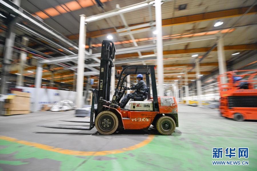 在中汽(天津)汽车装备有限公司车间,工人在操作叉车(2月14日摄)。新华社发(孙凡越摄)