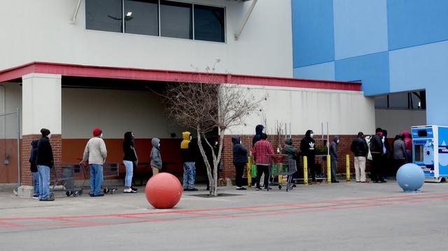 2月18日,人们在美国得克萨斯州休斯敦市排队等待进入一家超市购物。有些超市推出限流措施,顾客需排队才能进入超市采购。新华社发(劳承跃摄)