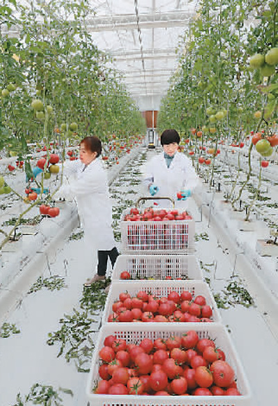 在浙江省湖州市德清县阜溪街道龙胜村的水木莫干山都市农业园区内,工人正在智能温室采摘西红柿。