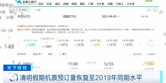 在线旅游平台去哪儿数据显示,目前清明假期国内机票预订量已经接近2019年同期水平。从预订情况来看,成都—林芝和林芝—成都是清明小长假出行热度最高的两条航线,平均支付价格分别为1508元和1500元。