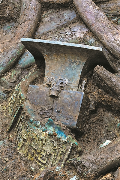 3号“祭祀坑”内拍摄的青铜器和象牙