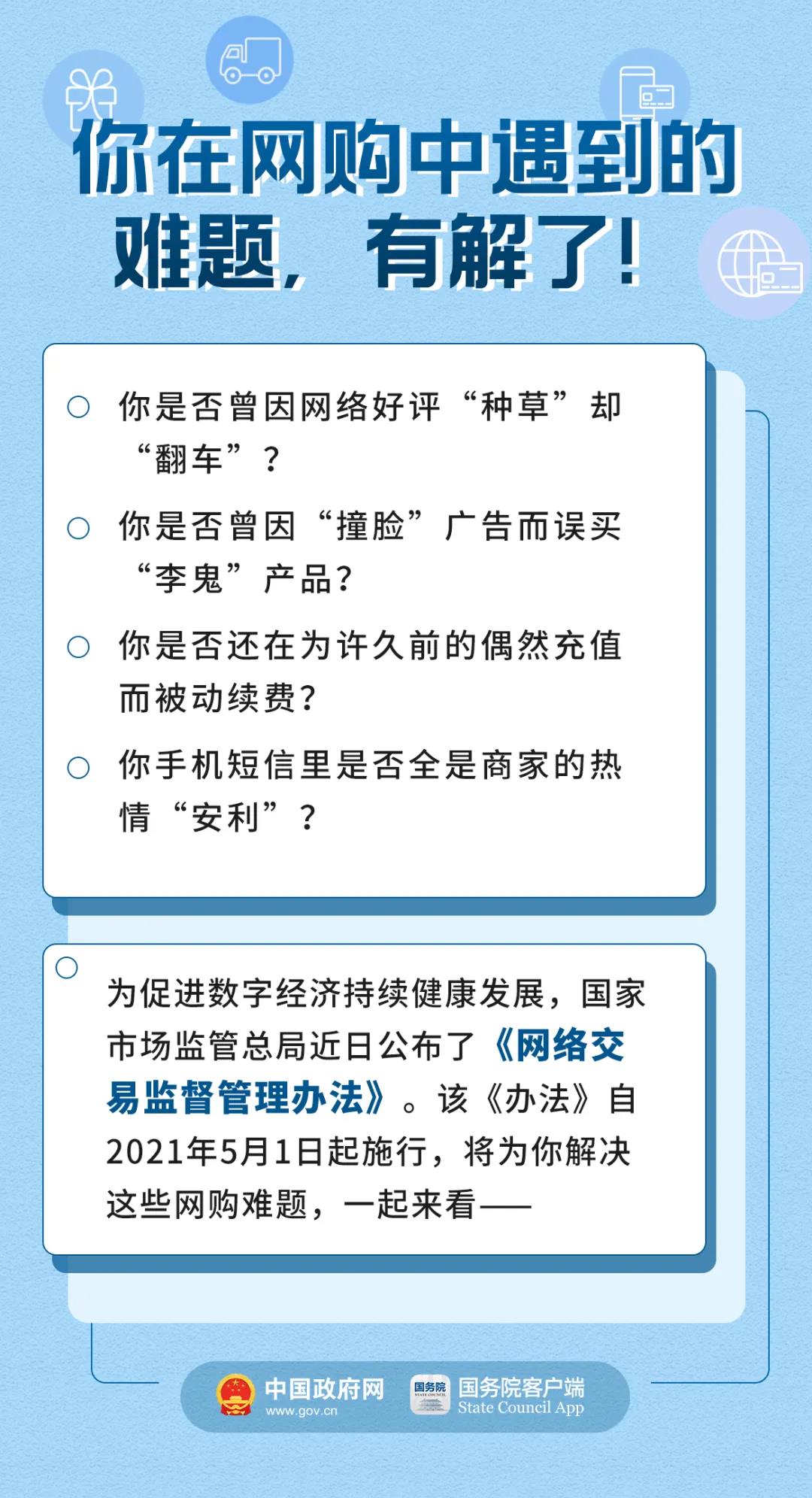 为促进数字经济持续健康发展,国家市场监管总局近日公布了《网络交易监督管理办法》。该《办法》自2021年5月1日起施行,将为您解决这些网购难题,中国政府网公众号刊登文章,一起来看看吧。