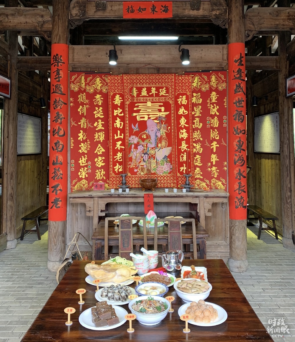 在俞邦村,习近平考察了夏茂特色小吃民俗文化馆。馆中最吸引眼球的当属这桌丰盛的寿宴。按照当地习俗,寿宴当天,大公鸡、寿饼、寿酒、寿桃、寿面、寿烛、寿炮都是必备之礼。