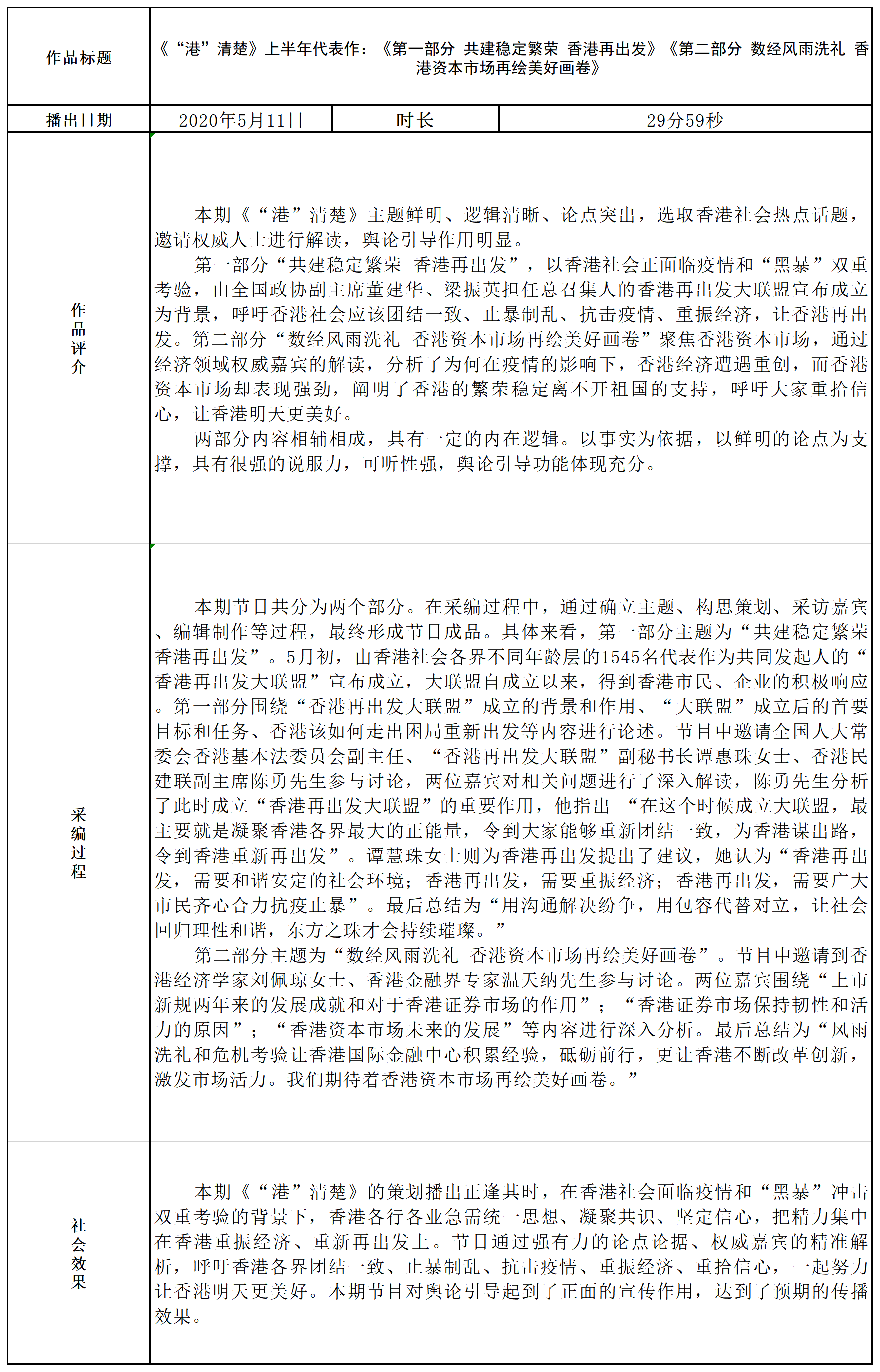 《“港”清楚》节目是中央广播电视总台广播端重点节目,突出评论特色,是2019年9月1日粤港澳大湾区之声开播时打造的粤语节目,从形式到内容贴近性强,主动设置议题,在香港“修例风波”、“香港国安法”实施等多个重要时间和事件节点发挥了独特的舆论引导功能,策划意识强,内容丰富,发声及时,分寸得当;日常节目力求体现国家大政方针的湾区视角和港澳情怀,对港澳宣传专业性强;制作简洁,内容严谨,克服了现代广播节目中比较常见的“口水话”多的毛病,显得深、细、实。