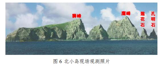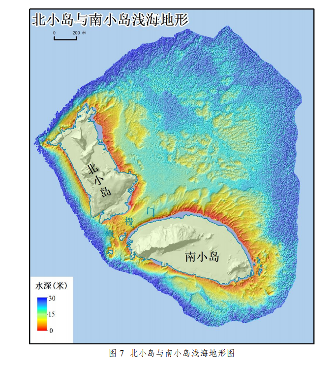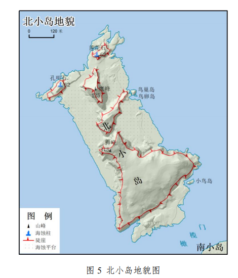 北小岛属侵蚀剥蚀丘陵地貌,地形起伏较大,海岸类型为基岩海岸,海蚀作用强烈,发育有海蚀崖、海蚀平台、海蚀柱等海蚀地貌。北小岛东南部的狮峰(118米)与其西北的鹰峰(125米)、莲花石(62米)和孔明石(62米)等三个独立尖岩,经海蚀平台连成一体。图4、图5和图6分别为北小岛遥感影像图、地貌图和现场观测照片。北小岛与南小岛之间的橄榄门水深在10米左右,宽约200米。两岛的近岸浅海区域(30米以浅)连成一片,西南侧狭窄,而其东北侧宽阔延伸近2000米,其间分布了一系列潮沟地形。北小岛西南和东北两侧海岸有大量垂直于海岸的潮沟和礁坪发育。图7为北小岛与南小岛浅海水下地形图。