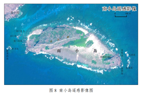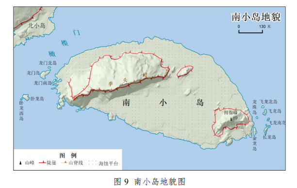 南小岛属侵蚀剥蚀丘陵地貌,总体呈椭圆形,由岛屿主体拳头岭与东南的一个尖岩——拇指峰,经海蚀平台连接而成。地势西北、东南高,中间部位低。图8和图9分别为南小岛遥感影像图和地貌图。根据图7所示,南小岛的近岸浅滩与北小岛连成一片,且南小岛东北侧海岸有大量垂直于海岸的潮沟和礁坪发育。