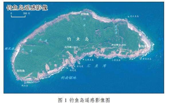 钓鱼岛属于侵蚀剥蚀低山丘陵,地形陡峭,中央山脉山脊线呈东西走向,连接主峰高华峰(海拔362米)和神农峰(海拔320米),位于岛屿中南部,形成了北坡稍缓、南坡陡峭的地形格局。图1和图2分别为钓鱼岛遥感影像图和地貌图。钓鱼岛近岸有较为宽阔的浅海区域,尤其是东钓角附近,有宽广的水下浅滩发育,并与飞屿周边浅滩相连接。图3为钓鱼岛近岸30米以浅区域的地形图。