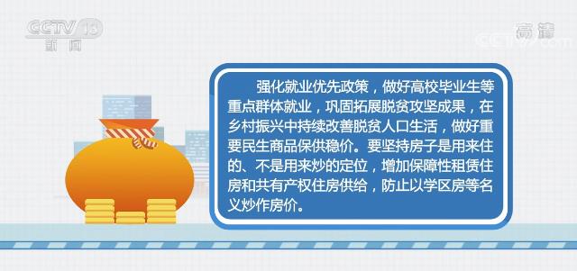 在就业、住房等保障和改善民生方面,会议要求,强化就业优先政策,做好高校毕业生等重点群体就业,巩固拓展脱贫攻坚成果,在乡村振兴中持续改善脱贫人口生活,做好重要民生商品保供稳价。要坚持房子是用来住的、不是用来炒的定位,增加保障性租赁住房和共有产权住房供给,防止以学区房等名义炒作房价。
