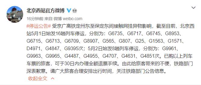 北京西站官方微博5月1日晚间发布消息,受京广高铁定州东至保定东间接触网挂异物影响,截至目前,北京西站5月1日始发16趟列车停运,分别为:G6735、G6717、G6745、G8953、G6715、G6713、G6709、G8907、G565、G807、G25、G1563、G1571、D4971、G4847、G9395次;5月2日始发8趟列车停运,分别为:G9961、G9963、G9965、G4487、G4955、G4707、G4631、G4851次。已购以上列车车票的旅客,可于30日内办理全额退票手续。