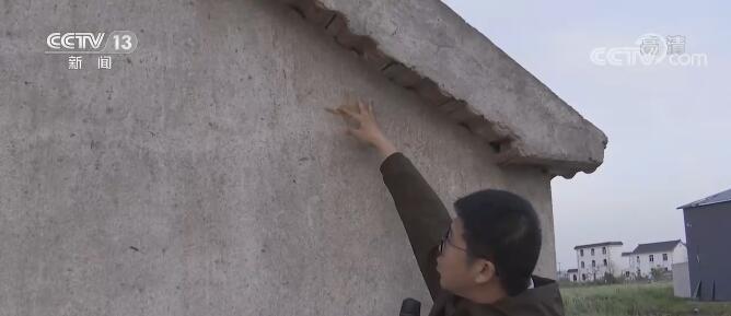 总台央视记者 徐大为:一路走过来, 村里不少的房屋受到了严重的损坏。在我前方有8间瓦房是整体被风吹得垮塌了,4月30日夜间的风到底有多大呢?我们可以通过一个细节来看一下,这间瓦房被风吹出了一个窟窿眼,当时大风卷起石块和瓦块砸到上面,当时石块被卷起的高度有多高?大家看,在这上面就有瓦块砸到墙上留下的印迹。