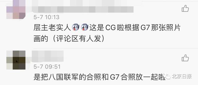 该幅看起来像一张泛黄旧照片的作品,是作者根据5月4日七国集团代表在英国伦敦会晤时拍摄的集体照绘制的。