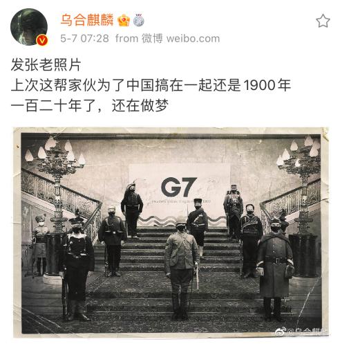 5月7日,画家@乌合麒麟 在个人微博中发了一张“老照片”,配文:“上次这帮家伙为了中国搞在一起还是1900年。一百二十年了,还在做梦。”