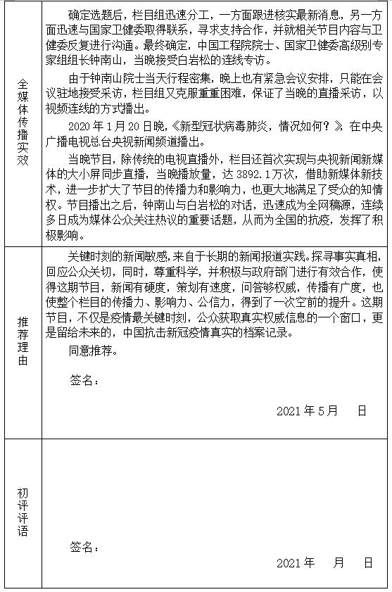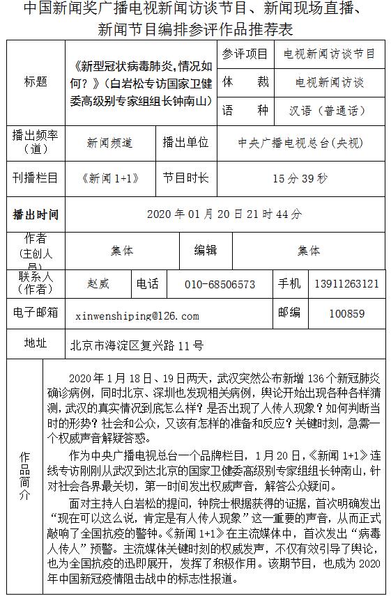 正在阅读:《<新型冠状病毒肺炎,情况如何?>(白岩松专访国家卫健委高级别专家组组长钟南山)》参评推荐表