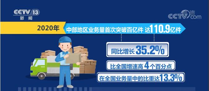 《2020年中国快递发展指数报告》中还显示,中部地区业务量首次突破百亿件。此外,快递业支撑实物商品网上零售额达9.8万亿元。