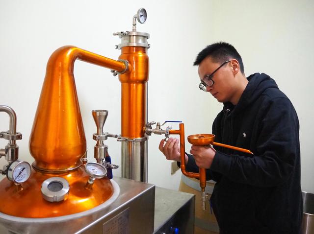 郭江正在调试酿酒的蒸馏设备。新华社记者 金一清 摄