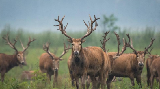 一群麋鹿在石首麋鹿国家级自然保护区内活动。