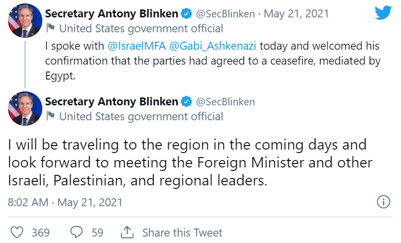 【环球网快讯】据俄卫星社刚刚消息,美国国务卿布林肯21日在推特上宣布,自己即将出访中东会见以色列、巴勒斯坦及该地区其他领导人。