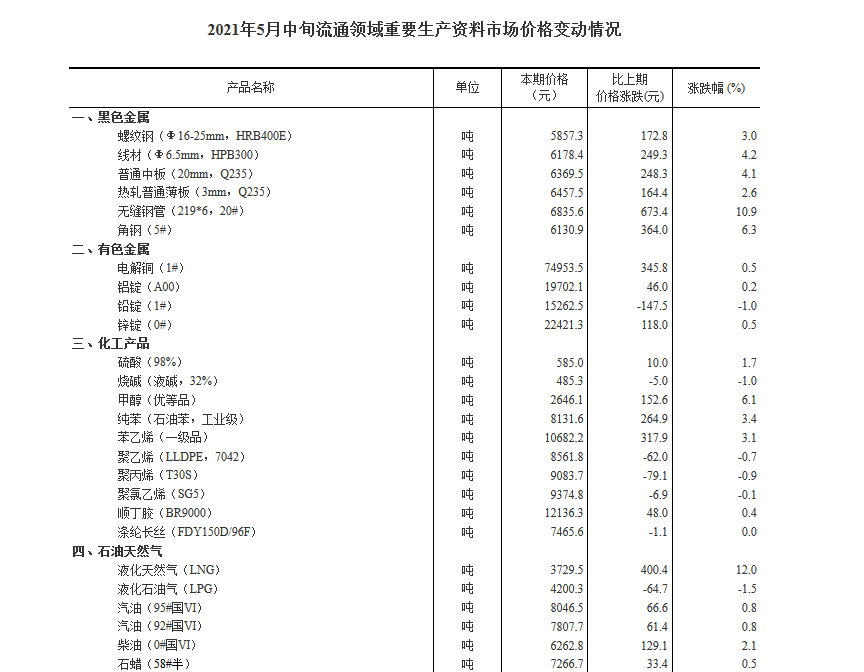 2021年5月中旬流通领域重要生产资料市场价格变动情况