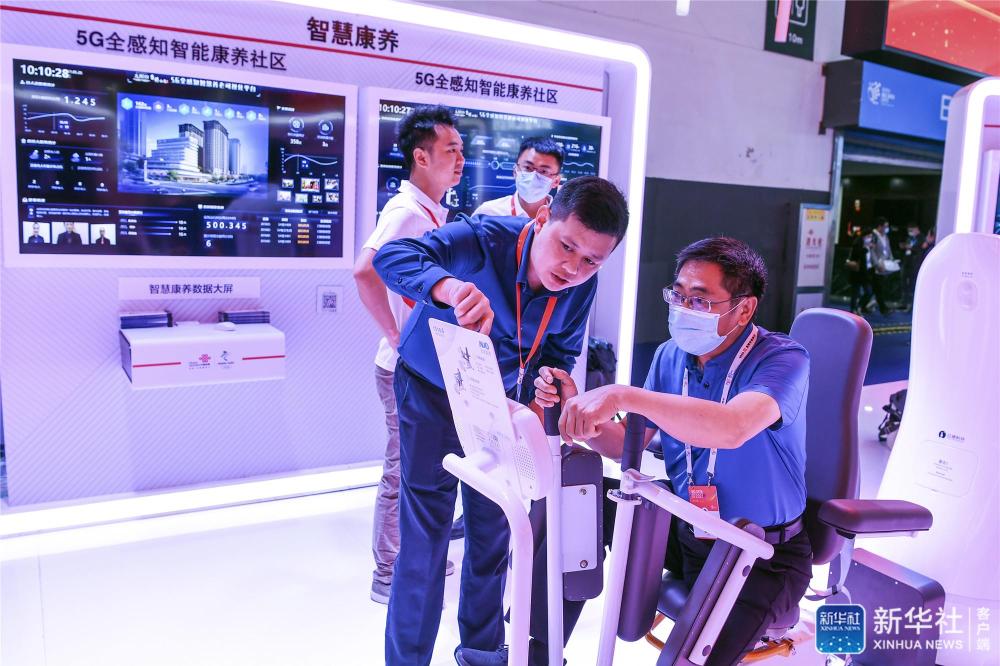 5月26日,参会者(右一)在数博会上体验5G智慧康养运动器械。新华社记者 杨文斌 摄