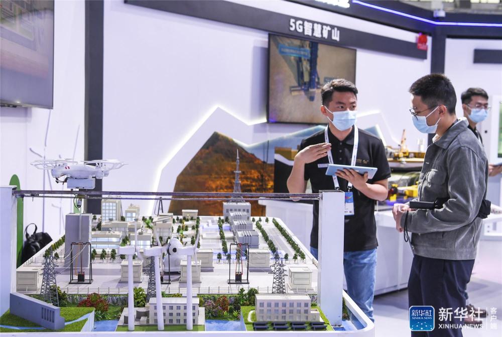 5月26日,参展工作人员(左)在数博会上向参会者介绍5G智慧电力。新华社记者 杨文斌 摄