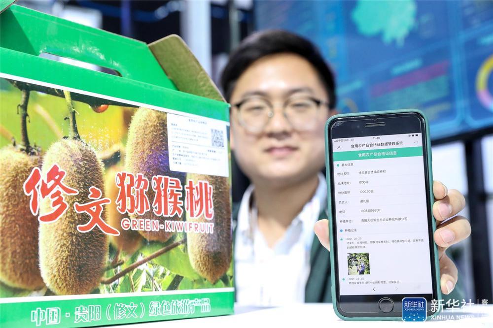 5月26日,参展工作人员在数博会上展示农产品大数据溯源系统查询猕猴桃信息。新华社记者 欧东衢 摄