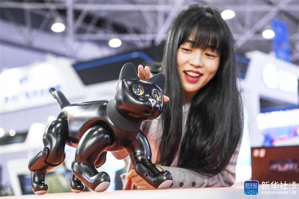 5月26日,参展工作人员在数博会上与一款AI仿生机器猫互动。新华社记者 杨文斌 摄