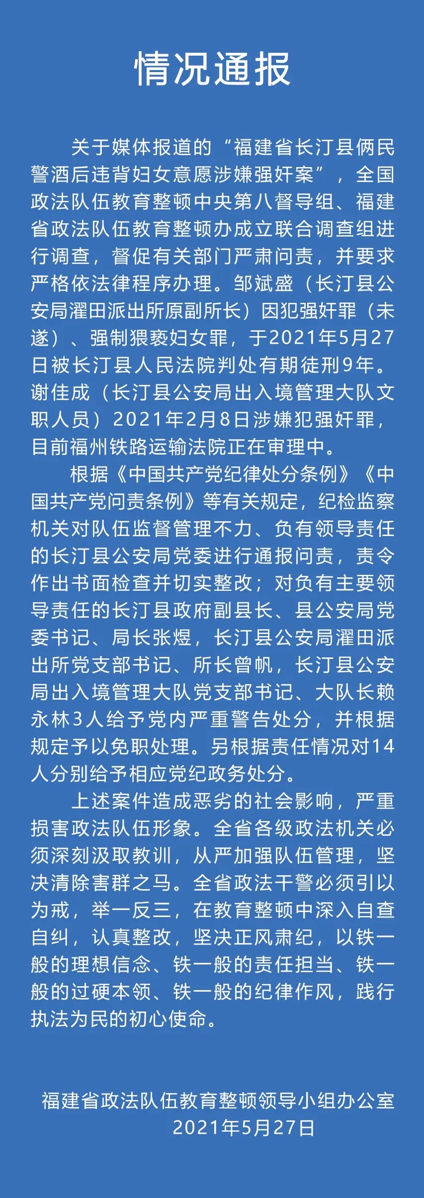 央视网消息:据“清朗天空”微信公众号5月27日消息,关于媒体报道的“福建省长汀县俩民警酒后违背妇女意愿涉嫌强奸案”,全国政法队伍教育整顿中央第八督导组、福建省政法队伍教育整顿办成立联合调查组进行调查,督促有关部门严肃问责,并要求严格依法律程序办理。