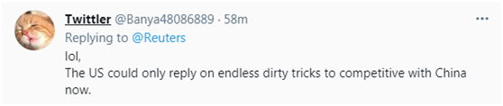一些网友则联想到了与中国的竞争。有网友讽刺称,“呵呵,美国现在只能用没完没了的肮脏伎俩来与中国竞争。”
