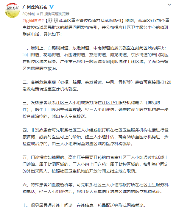 广州市荔湾区针对9个重点管控街道居民群众的就医问题发布指引,并公布相应社区卫生服务中心的值班联系电话。