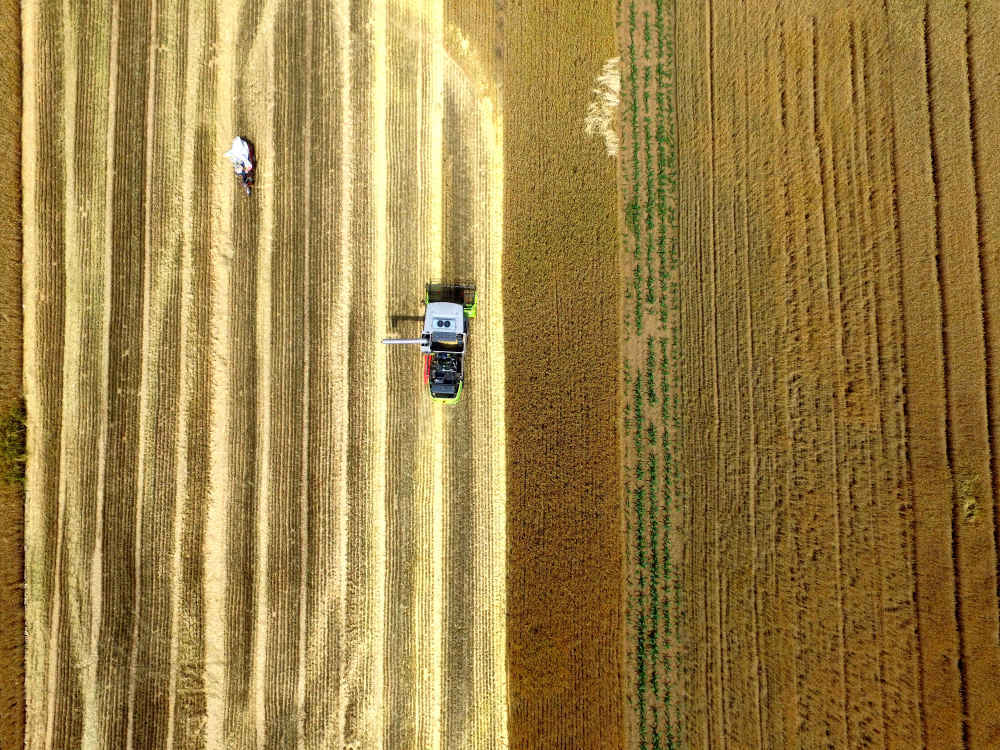 6月1日,收割机在山东省临沂市郯城县郯城街道三井村田间收割小麦(无人机照片)。新华社发(张春雷 摄)