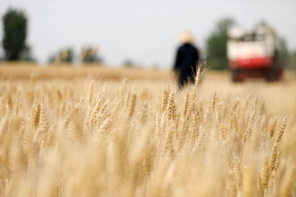 6月1日,收割机在山东省临沂市郯城县郯城街道三井村田间收割小麦。新华社发(张春雷 摄)