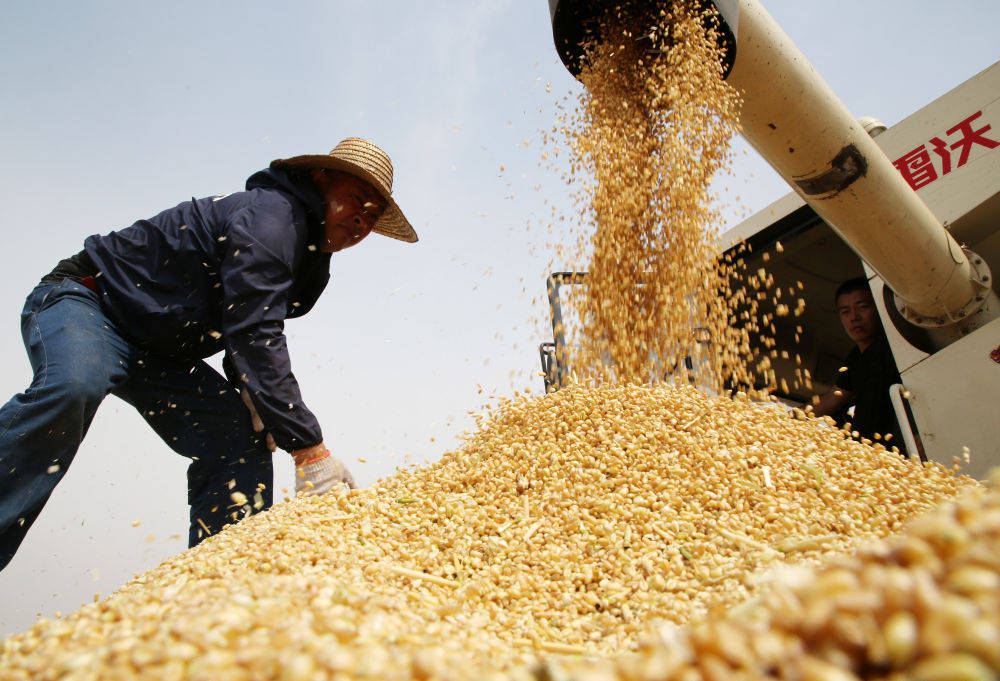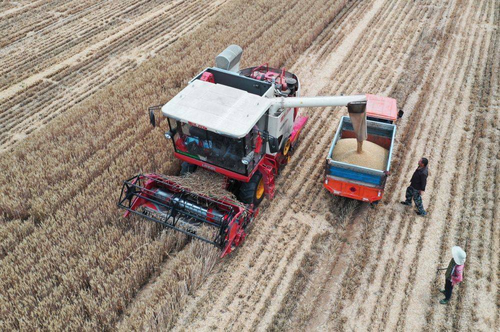 6月1日,山东省临沂市郯城县郯城街道三井村村民将收获的小麦装车。新华社发(张春雷 摄)