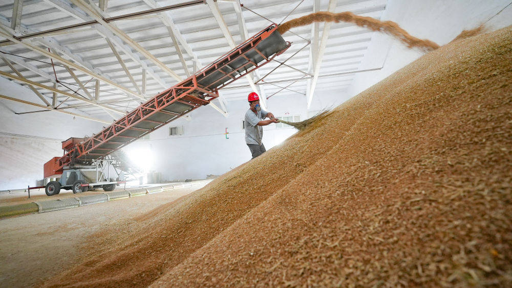 6月1日,在鲁粮集团鲁南国家粮食储备库,工作人员对入库小麦打掠麦糠。新华社发(尹召功 摄)