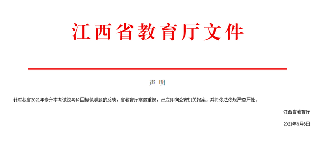 6月5日江西省举行的2021年普通高校专升本考试出现统考科目疑似泄题事件,江西省教育厅6月6日凌晨通过其官方微博回应,已立即向公安机关报案,并将依法依规严查严处。