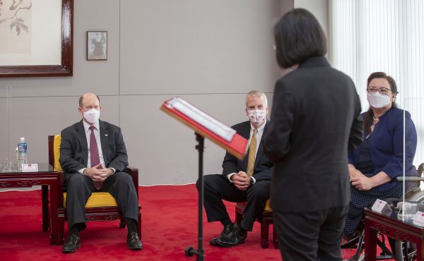 然而,在国际政治的大博弈中,民进党当局毕竟不是“棋手”,只是在扮演“棋子”的角色,其中冷暖,民进党当局领导人自然是知道的。有趣的是,在民进党当局领导人办公室今天对外媒发布的一张照片里,美国三名参议员戴着厚厚的口罩正襟危坐,而民进党当局领导人毕恭毕敬地站在那里,背对着镜头,似乎正在看讲话稿,不禁让人感慨充满了对美国参议员汇报工作的即视感。而这幅画面,刚好是对“美台勾连”中,台湾作为“棋子”地位的最完美揭露!