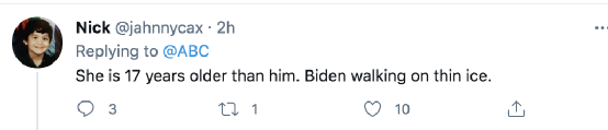 对于拜登的这个说法,再相比两人的年龄差距,许多网友认为,“太尴尬了”。