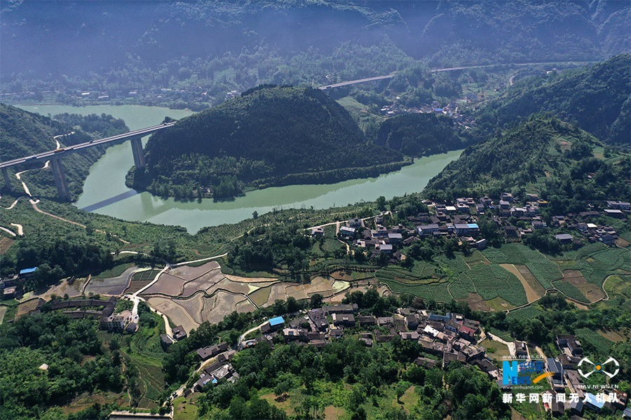 渝湘高速公路阿蓬江特大桥从大坪村穿过。新华网发(杨敏 摄)