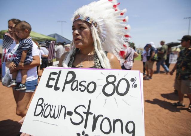 2019年8月7日,在美国得克萨斯州埃尔帕索市,印第安裔美国人普丽西拉·佩雷斯手举标语参加反种族主义集会。(新华社记者王迎摄)