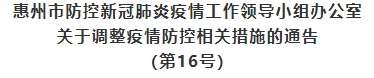 央视网消息:据“惠州发布”公众号消息,广东省惠州市防控新冠肺炎疫情工作领导小组办公室7月3日发布《关于调整疫情防控相关措施的通告(第16号)》,全文如下: