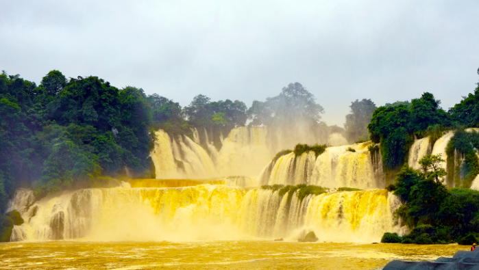 位于中越边境的跨国瀑布——德天瀑布变身“黄金瀑布”,呈现出难得一见的壮观景象。