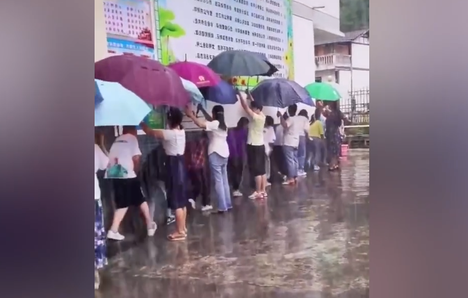 ·小学生去食堂路上突遇暴雨,老师们一字排开撑伞护送。