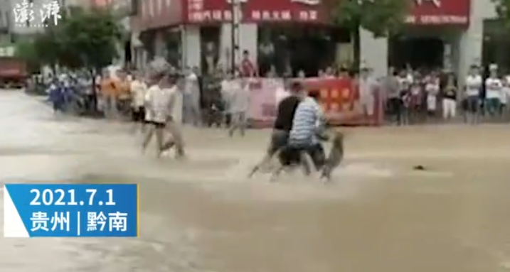 ·贵州平塘暴雨导致部分道路被淹,有市民在街头撒网捕鱼。