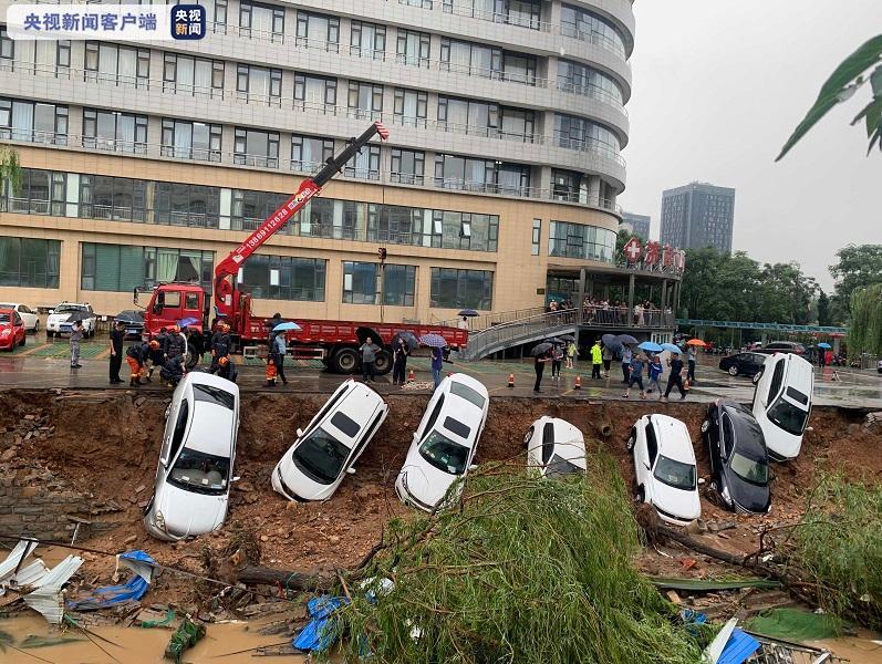 受强降雨影响,7月12日14时58分,山东省济南市高新区一处靠近泄洪沟的路面突然出现大面积坍塌,停在路边的十余辆车坠落排洪沟,现场情况十分紧急。