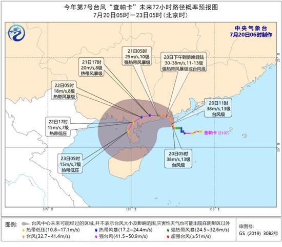 据中央气象台消息,今晨5时,台风“查帕卡”的中心位于广东阳江东南方约90公里的近海海面上,中心附近最大风力有13级(38米/秒)。预计,“查帕卡”的中心将回旋或缓慢移动,并于今天下午到傍晚在广东台山到电白一带沿海登陆(强热带风暴级或台风级),登陆后转为偏西方向移动,强度逐渐减弱。中央气象台7月20日06时发布台风橙色预警。