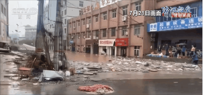 河南省巩义市委宣传部副部长 席旭红:7月20日下午的时候天降暴雨,大约就是20多分钟的时间,20分钟水位涨了1.5米左右。整个汜河全部都被淹了,所以米河就成了眼下受灾最严重的地区。很多的车辆就被冲毁了,道路被冲塌,大树都被水冲断,电线杆也都被冲断了。